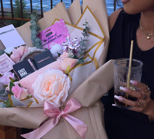 BOSS LADY BOUQUET - HUDA BEAUTY - Maquillage célébre collector, Accessoire strass bijoux, Trousse maquillage velours premium, Pince fleurs cheveux, Soins visage détente x2 - 84cm x 58cm