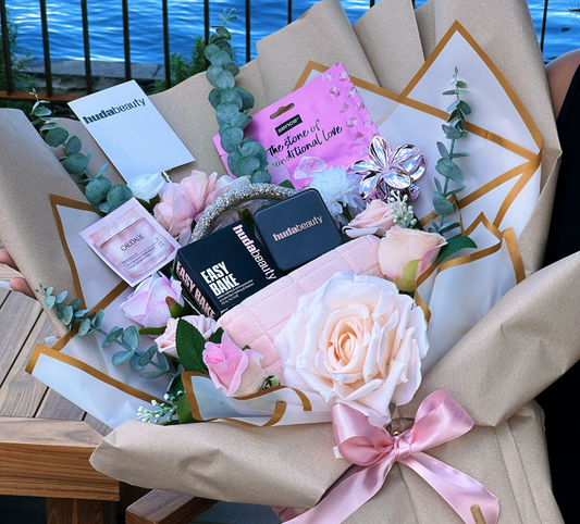 BOSS LADY BOUQUET - HUDA BEAUTY - Maquillage célébre collector, Accessoire strass bijoux, Trousse maquillage velours premium, Pince fleurs cheveux, Soins visage détente x2 - 84cm x 58cm